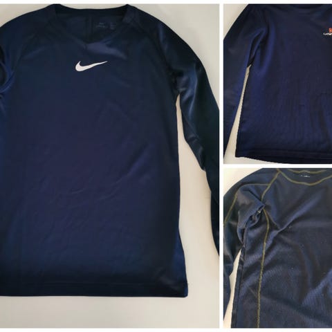 Sininen tekninen aluspaita Nike Pro, dri-fit koko jrS (137-147), pieni kaulus, sopii esim Hjk treenivarusteisiin.