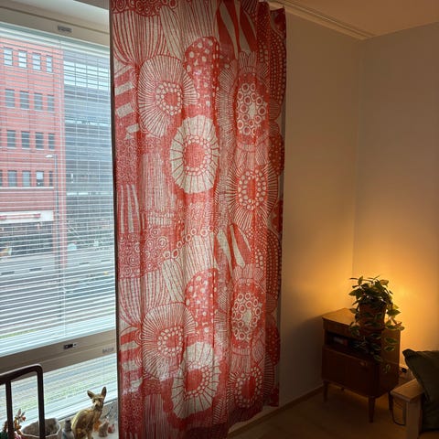Myydään Marimekon Siirtolapuutarha -kankaasta ommeltu verho. Koko 142 cm x 248 cm. Verhoa on pesty, mutta värit ovat vielä kirkkaat. Ei tahroja tai repeymiä. Jonkun itse ompelema. Toridiili tai nouto Helsingin Postipuistosta.