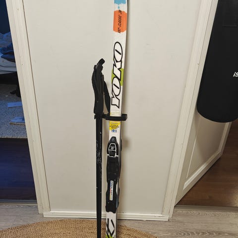 Tecnopro lasten sukset sns siteellä ja sauvat. Sukset 120cm ja sauvat 90cm.