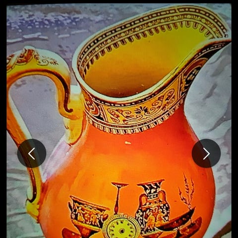 Sininen posliininen kannu, jossa koristeellinen kuvio. Korkea ja kapeamuotoinen, soveltuu koriste-esineeksi tai maljakoksi.
