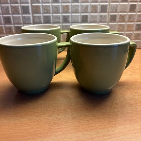 Kermansaven keltaiset Oliivi-mukit 8 kpl. Ehjät ja hyväkuntoiset. Mukin korkeus 8 cm ja halkaisija 8 cm.