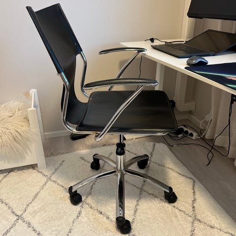 Kaksi mustaa nahkaverhoiltua Tehokalusteen Kilta-tuolia. Yhdessä kiinteät jalat, toisessa pyörivä ja keinuva jalka. Jalan mekanismi ja tuolit muutenkin ovat kunnossa, mutta pehmusteet ja verhoilu ovat nähneet parhaat päivänsä. Uudelleen päällystämällä näistä saa vielä oikein käyttökelpoiset. Pyöriväjalkainen on ollut useamman vuoden käytössä toimistotuolina.