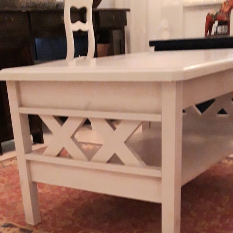 Kierrättyspuusta valmistettu sohvapöytä, tukeva. 4 laatikkoa. Löytyy käytön jälkiä, mutta yleisilme siisti. Valkoinen, ruskea.