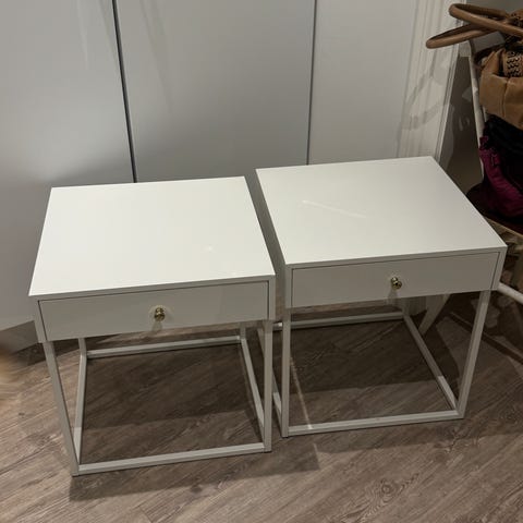 Myydään valkoiset yöpöydät, 2 kpl. Hyvä ja siistikuntoiset, mutta yöpöytien takapuolella ajan tuomaa kellastumaa, toisessa pöydässä enemmän.