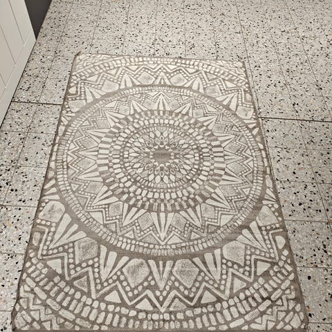 Ruskeanharmaasävyinen(?) upea koivunlehtikuvioinen Vallilan iso viskoosimatto. Muuten kunto erittäin siisti, mutta toisesta päästä purkautunut reunakanttaus (ks. Kuva).