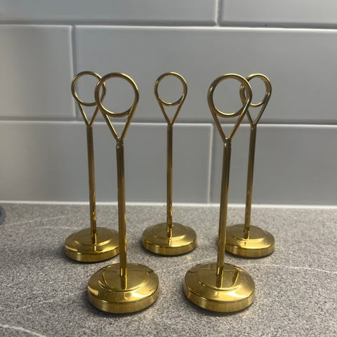 Laadukkaita metallisia korttipidikkeitä 15 kpl, täysin moitteeton kunto. Tukevat ja sopii esim. menukorttipidikkeeksi tai paikkakorttipidikkeeksi juhliin/häihin.