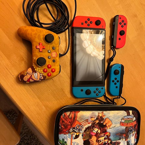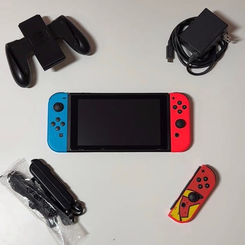 Nintendo Switch pelikonsoli, jossa on punainen ja sininen Joy-Con-ohjain. Tästä halvalla pelkkä konsoli! Tarvikkeita ei valitettavasti ole olemassa. Testattu toimivaksi.