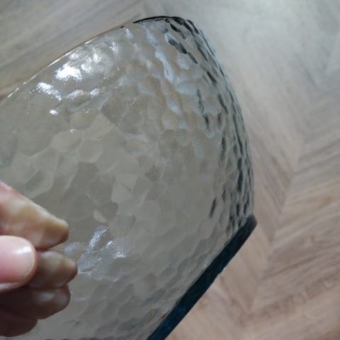 Sydämenmuotoinen lasikulho, kukalliset kohokuviot ulkopuolella. Moitteeton kunto.