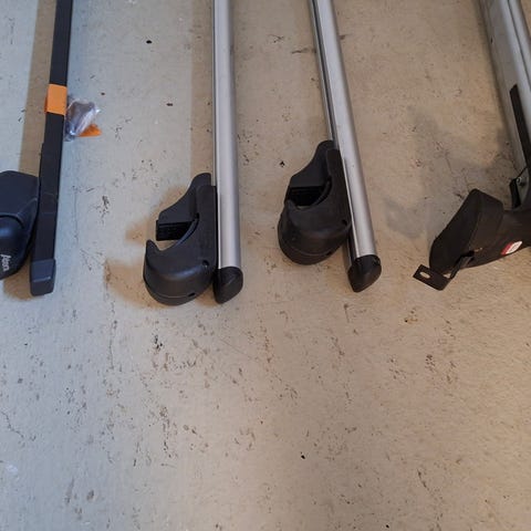 Myydään taakkatelineet / kattotelineet. Pituus 109cm. Käy autoihin, missä kattokaiteet ovat irti auton katosta (katon ja kaiteen väliin jää rako).
