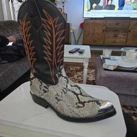 Miesten tylppäkärkiset bootsit. Väri ruskea. Vähän käytetyt. Pohjien sisäreunoissa käytön jälkeä ks kuvat. Koko valmistajan mitoitustaulukon mukaan 46, mutta minulla 44 jalka ja kengät tuntuvat sopivilta. Bootsien pitää ilmeisesti olla aika tiukat. Myyn vähäisen käytön vuoksi.