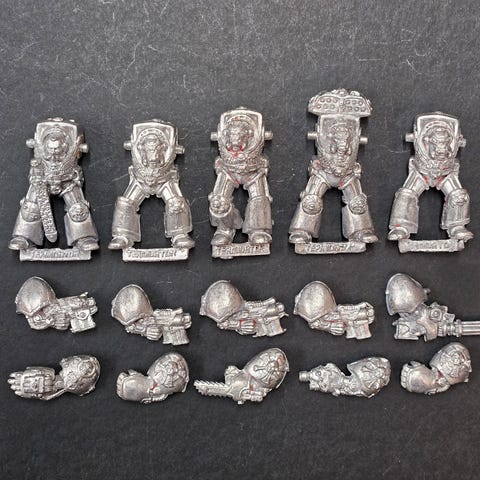 Warhammer 40000 Rogue Trader -pelin metallisia Space Marine figuja 2 kpl jostain 80-luvulta.