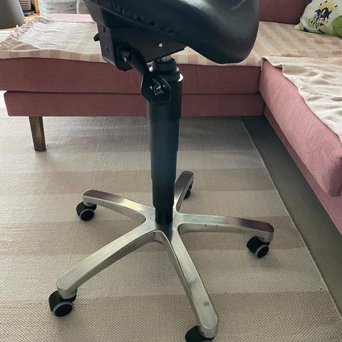 Ehjä satulatuoli, istuin 35x40cm. Säädettävä korkeus, 60-80cm. Istuinosan alla erillinen joustopusla. Aitoa nahkaa, juuri huollettu. Jalka alumiinia. 2,5" pyörät.