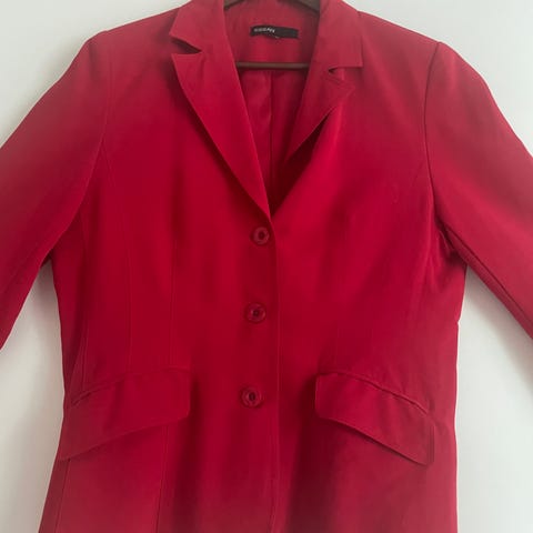 Harmaa, vuorillinen bleiseri. Päällikangas 64 % polyesteria, 34 % viskoosia ja 2 % elastaania. Raidallinen vuori 51 % viskoosia ja 49 % polyesteria. Pituus 59 cm (takaa keskeltä mitattuna), kainalosta kainaloon 58 cm. Sopii hyvin 42-kokoiselle.