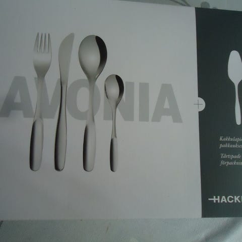 Hackman Savonia aterinsetti sisältää veitsiä, haarukoita ja lusikoita. Aterimet on pakattu useisiin erillisiin pakkauksiin, jotka näkyvät kuvissa.