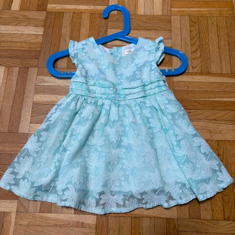Sininen ja valkoinen raita, sekä punaisia kirsikoita. Hihoissa söpöt röyhelöt. Takana nappi helpottamassa pukemista.