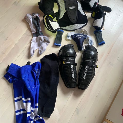 Bauer, CCM , Reebok, Warrior jääkiekon varustepaketti sisältää sääri-, hartia- ja alasuojat, hanskat, sukat, housut, kaulasuojan (1kpl), kyynärsuojat. Sopii jääkiekon harrastamiseen ja harjoitteluun. Koko 4-7 v. , kiekkokoulu esim. Tosi kevyt ja hyvä setti aloittamaan/kokeilemaan jääkiekkoa.