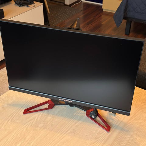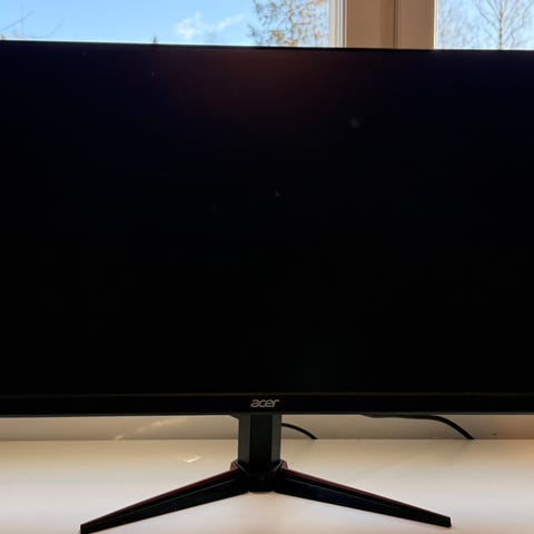 Acer XB270HU 27 tuuman näyttö, jossa on NVIDIA G-SYNC -tuki. Näyttö soveltuu erilaisiin käyttötarkoituksiin, kuten pelaamiseen ja yleiseen tietokoneen käyttöön. Kuvissa näkyy portit yms. Näytössä on pieni skraidu alhaalla keskellä ks kuva 1.
