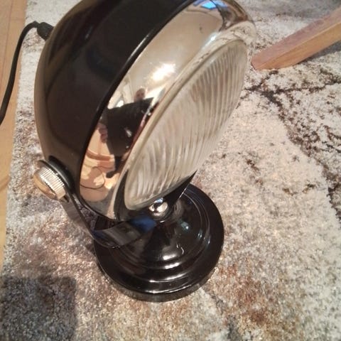 Pöytävalaisin noin 50cm korkea. Musta kangaspäällysteinen varjostin, metallijalka.