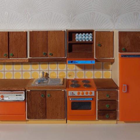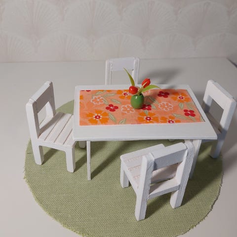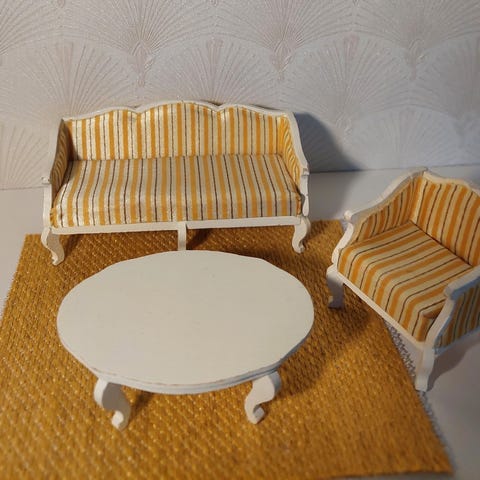 Uusrokokoo-tyyliset ruokapöytä plyyshiverhoilluin tuoleineen sekä saman sarjan astiakaappi. Kaapista puuttuu kaksi kahvikuppia.