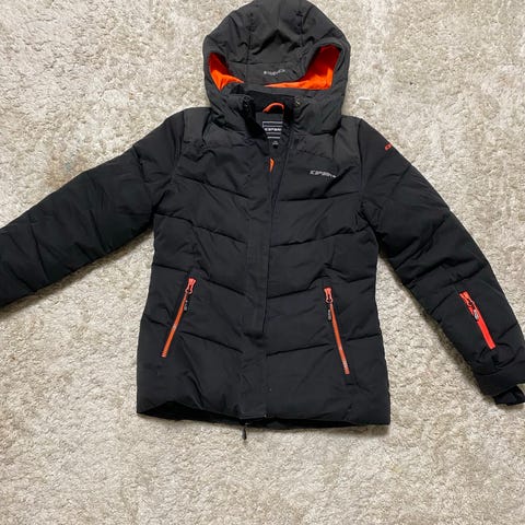 Hyvä kuntoinen ja lämmin Fireflyn toppa-/laskettelutakki. Väri melerattu tummanharmaa, kukkakangas tehosteilla.