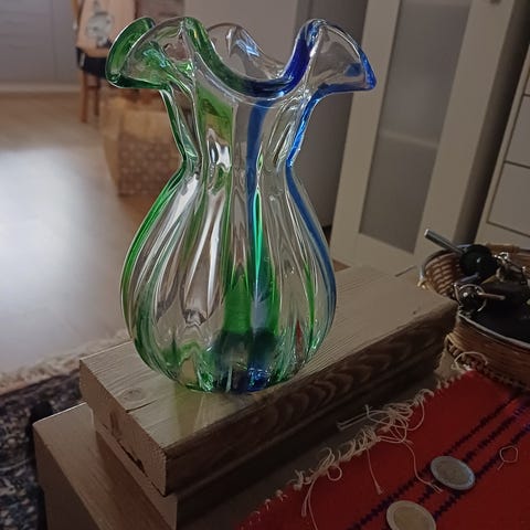 Kaksi maljakkoa. Matalampi 15 cm ja muutama pieni pala pois reunasta. Isompi 20 cm ja siinä isompi pala pois. Onko vielä jollekin käyttöä?