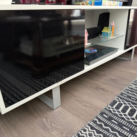 Valkoinen tv-taso, kunto kohtalainen. Kaikki toimii ja on tukeva, mutta joitain käytönjälkiä näkyy pinnassa ja kiskot hieman kuluneet. Ei kuitenkaan mitään silmään pistävää tai käyttöhaittaa.