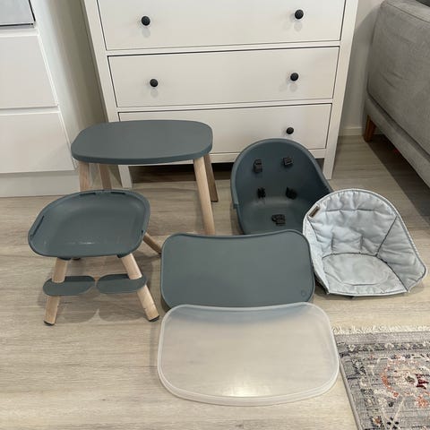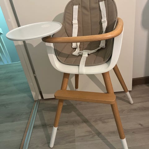 Sievä ja hyväkuntoinen Micuna Ovo syöttötuoli. Värinä valkoinen / vaalea puu. Mukana valjaat, joissa pientä kulumaa mutta oikein käyttökelpoiset vielä. Tarjottimelle saa helposti laitettua sormisyötäviä, ja sen saa tarvittaessa myös irti. Tukeva, ei keiku eikä huoju.