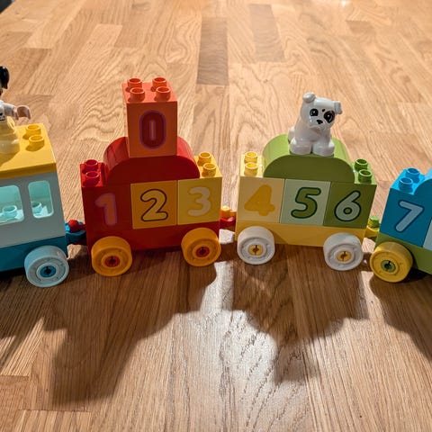 Kiva setti Lego-uraa aloittelevalle pienelle. 5-vaunuinen juna matkustajineen ja junarata.