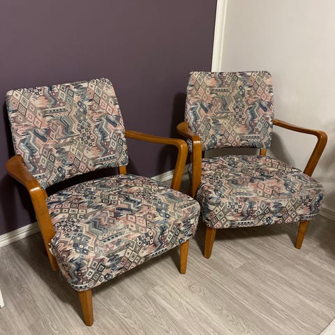 Myydään 2 vanhaa nojatuolia. Kankaat ehjät ja siistit. Puuosissa takana hyvin pientä kulumaa.