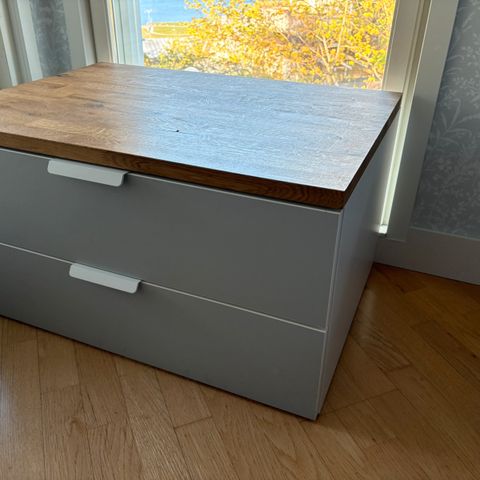 Ikean valkoinen lipasto lasikannella ja 4 laatikolla, jotka avautuvat painamalla.