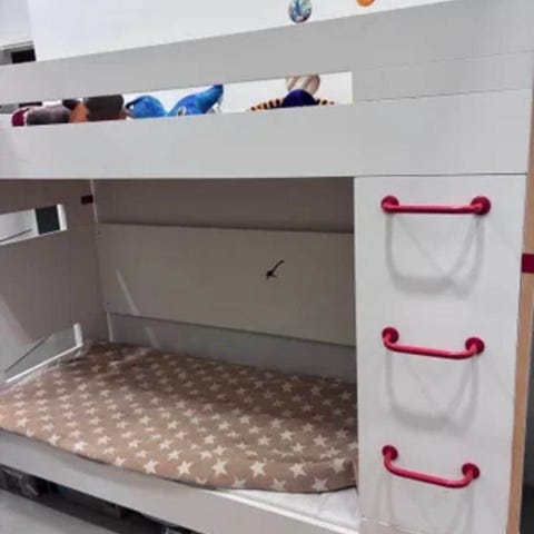 Lasten käytössä ollut kerrossänky. Yläpedin yksi lauta murtunut ja tuettu rautalevyllä. Lasten tarroja ja piirrustuksiakin löytyy. Myydään patjoineen.