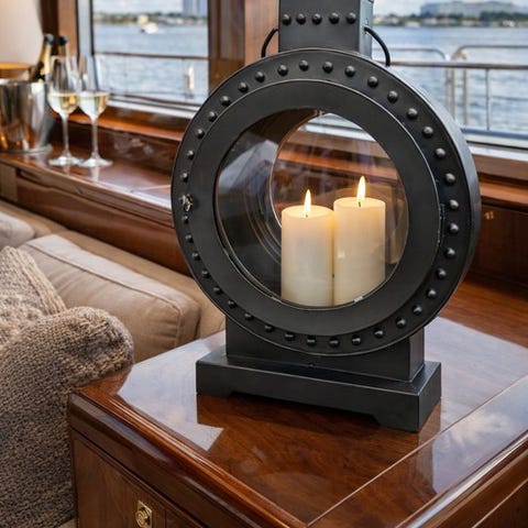 Tämä erottuva porthole-kynttilälyhty on saanut vaikutteita klassisista laivaston ikkunoista, tuoden hienostuneen merellisen ilmeen mihin tahansa sisustukseen. Kestävästä metallikehyksestä valmistettuna se luo lämpimän ja tunnelmallisen hehkun, kun se on sytytetty.