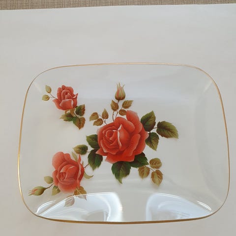 Myydään hyväkuntoinen ja kaunis englantilainen vintage ruusukuvioinen lasilautanen/lasitarjotin.