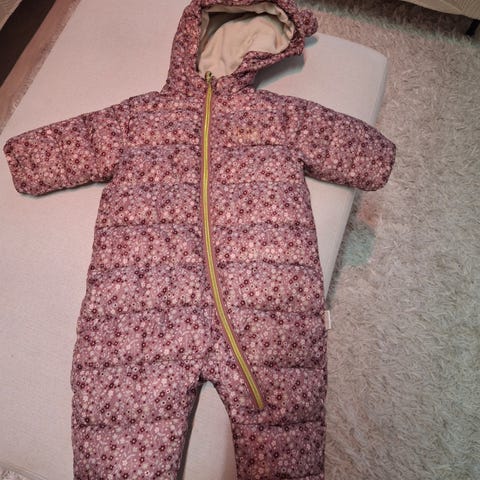 Ehjä ja siisti toppapuku seuraavalle pienelle. Sisällä fleecevuori muualla paitsi hihoissa. Hihojen päissä fleecetumput. Irroitettava huppu. Jalkalenksut ehjät. Pieni tahra rinnuksessa, ei yritetty poistaa.