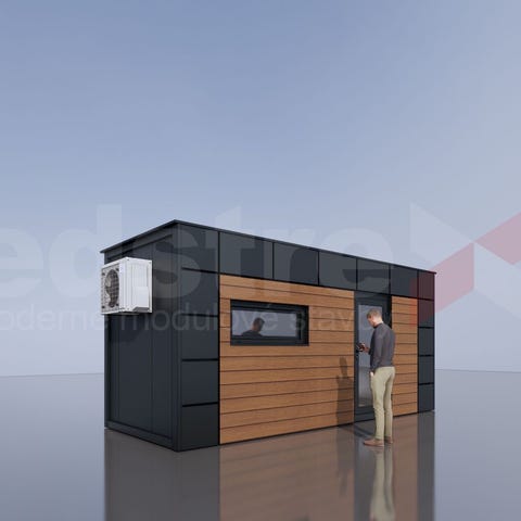 Modulirakennus työtila ja varasto, keltainen ulkoväri. Rakennuksessa on ikkunoita, ovi ilmalämpöpumppu ja sähköauton latauspiste. Sisätilassa on valaistus, työpisteitä ja hyllyjä. Soveltuu työskentelytilaksi tai varastoksi.