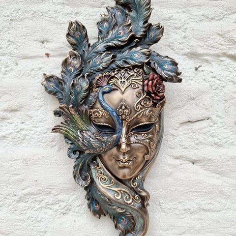 Erittäin kaunis koristeellinen seinäveistos venetsialaisesta maskista. Ilmeeltään kaunis. Tässä erittäin hyvässä kunnossa. Mitat ovat seuraavat: