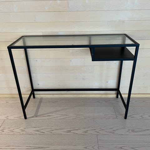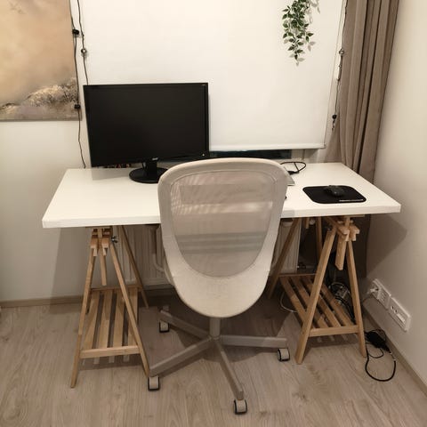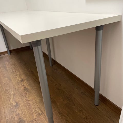 Ikea pöytä, jossa valkoinen taso ja harmaat pyöreät ja säädettävät jalat. Pöytä sopii monenlaiseen käyttöön, kuten työ- tai kirjoituspöydäksi.