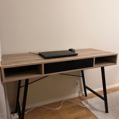 Työpöytä, jonka pinta on valkoinen ja mitat 120x60 cm. Pöytälevy on tasainen ja pöydässä on neljä metallijalkaa. Soveltuu esimerkiksi työ- tai opiskelukäyttöön.