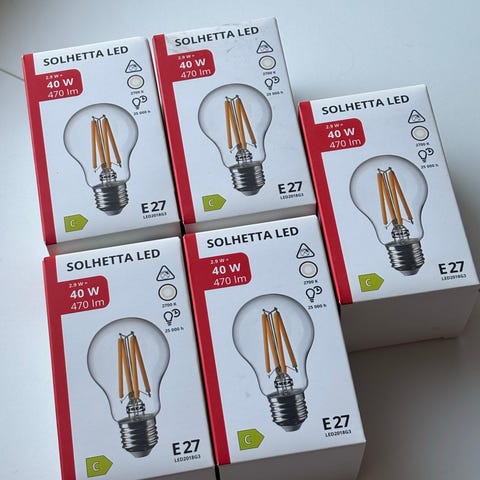 Neljä kappaletta käyttämättömiä IKEA:n Solhetta LED-polttimoita, kaikki yhteensä 3 euroa. Koko E 14, valon voimakkuus 40 W / 470 lm ja lämpötila 2700 K eli lämmin valkoinen.