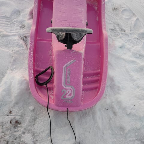 Stiga lasten rattipulkka jarrulla. Soveltuu hyvin pienemmille laskijoille, helppo ohjata ja jarruttaa. Kevyt vetää perässä ja lapsi voi ohjata samalla.