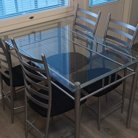 Lasipöytä jossa vuosien tuomaa jälkeä eli pieniä naarmuja siellä täällä.