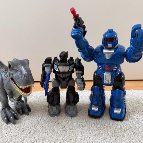 Kaksi robottia, jotka toimivat pattereilla. Kolme kilpeä, joilla annetaan roboteille komentoja. Ikäsuositus 5-vuotta. Mukana alkuperäinen laatikko, ohjeet ja patterit. Kissatalous.