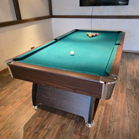 Biliardipöytä sinisellä pelipinnalla ja puisella rungolla. Pöydässä on kuusi taskua ja mukana on kuusi keppiä, uusi pallosarja 21 palloa ja kolmio. Sopii biljardin pelaamiseen sisätiloissa. Kotimainen valmiste, mitat korkeus 80, leveys 130 ja pituus 230 cm.