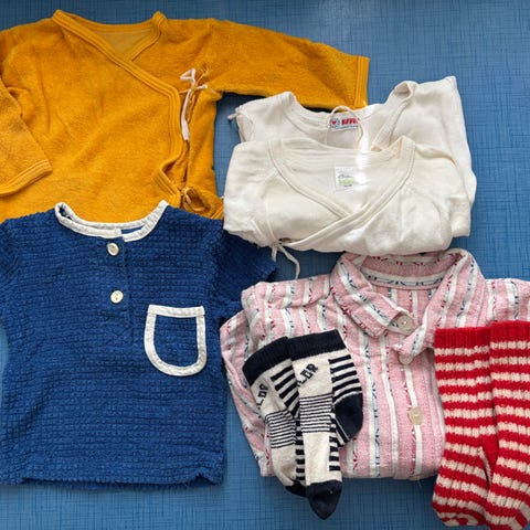 Sinivalkoraitainen kietaisupusero FIX koko 60 cm ja siniset frotee potkuhousut Rautex koko 60cm Hakusanoja : vauva retro vaate
