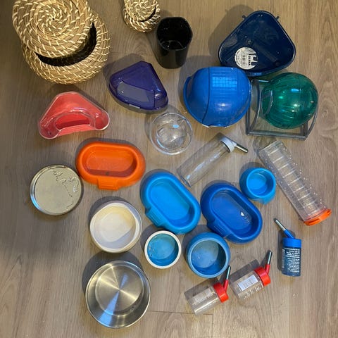 Kaksi hamsterin tai muun pienjyrsijän juoma-automaattia (toisessa kätevä imukuppikiinnitys), ruokakippo ja muita hamsterin tarvikkeita (kutterinpurua, herkkuja ym.)