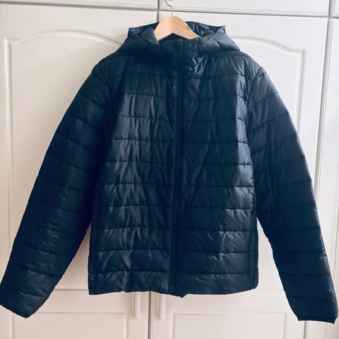 Hyvin vähäiselle käytölle jäänyt lämmin toppatakki. Pientä harmaata tahraa valkoisen raidan kohdalla.