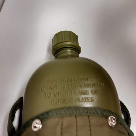 Kenttäpullo, lasia. Nahkapäällinen. Korkki joka toimii kuppina. Jäänyt vesi sisällä pakkaseen joten lasisisustan kunnnosta ei varmuutta. Testikäytössä ei vuotanut. Pituus 21cm, leveys 14cm, paksuus 5cm. Postitus tai nouto Hyrylä.