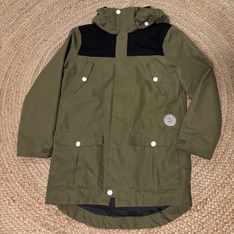 Takki on muuten siisti ja ehjä, mutta taskujen kohdalta keltaiset osuudet eivät ole tulleet puhtaaksi normaalissa pesussa.