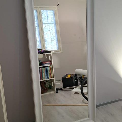 Jykevän oloinen peili. Metalliset kehykset. Koko 150cm x 55cm. Takapuolella kiinnityskohdat jos haluaa seinälle vaakaan tai pystyyn. Onttolassa.