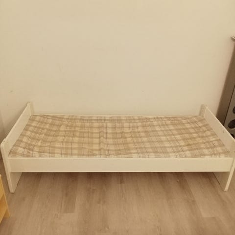 Hyväkuntoinen valkoinen puu sänky, sängyn mitat: leveys 86cm, pituus 208 ja korkeus 40cm. Patja 80x200, paksuus 8cm.